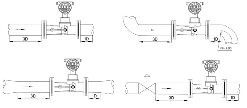 安裝注意事項 1.流量計應根據流向標志安裝。 2.流量計可水平、垂直或任意角度傾斜安裝。 3.上下游直管段要求見圖 4.被測介質內除含有較大顆粒或較長纖維性雜質外,一般無需安裝過濾器。 5.流量計周圍不應有強外磁場干擾及強烈的機械振動。 6.流量計必須可靠接地。