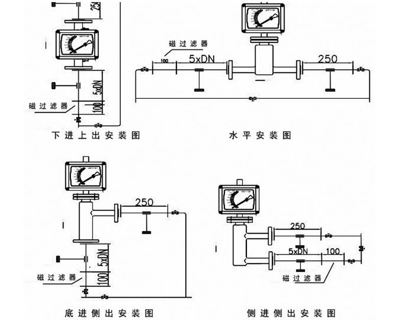 1.安裝操作之前,應(yīng)拆卸所有包裝,取出運(yùn)輸中固定浮子的部件,并檢查有無損壞。 2.安裝到工藝管道之前,將管道里的焊渣清洗干凈,防止管道中雜質(zhì)堵塞儀表,影響正常使用。 3.為了保證測量精度,推薦在流量計(jì)上游安裝5DN的入口直管段,下游安裝250mm出口直管段。 4.流量計(jì)有垂直安裝和水平安裝形式,如果是垂直安裝形式安裝垂直度應(yīng)該保證優(yōu)于1%,如果是水平安裝形式,安裝垂直度和水平度都應(yīng)該保證優(yōu)于1%。 5.若介質(zhì)中含有固體雜質(zhì),應(yīng)在閥門和直管段間加裝過濾器;若介質(zhì)中含有鐵磁物質(zhì),應(yīng)在流量計(jì)上游安裝磁過濾器。 6.由于金屬管浮子流量計(jì)安裝一個(gè)磁遠(yuǎn)傳系統(tǒng),要確保周圍其他設(shè)備產(chǎn)生的磁場不影響測量結(jié)果。 7.安裝在管道中的儀表不應(yīng)受到壓力的作用,儀表的出入口應(yīng)有合適的管道支撐,使儀表處于最小的應(yīng)力狀態(tài)。 8.低溫介質(zhì)測量時(shí),需選夾套型
