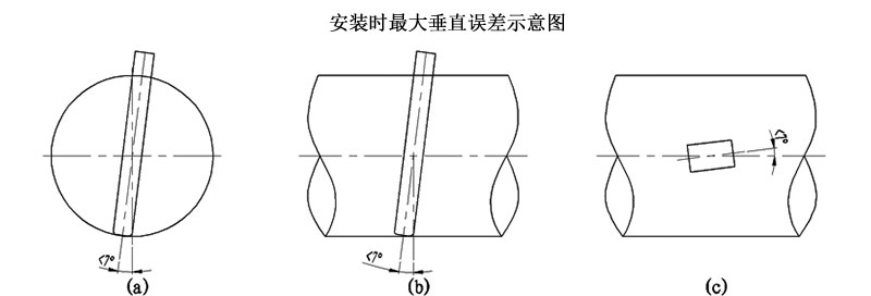 ●要求工藝管道的內(nèi)徑與傳感器的設計時一致。 ●插入式勻速管傳感器安裝時除了高壓孔應正對流速方向外,必須保證傳感器檢測桿與工藝管道的軸線垂直,夾角偏差應小于7°(圖a);傳感器總壓孔中心與管道軸線夾角應小于7°(圖b);檢測桿沿管道直徑方向插入到底部,其角度偏差小于7°(圖c)。