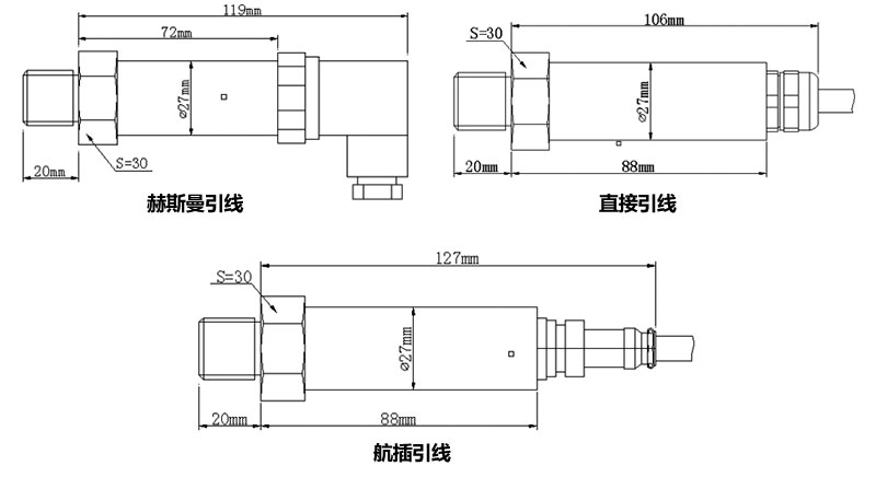 1、測量壓力范圍 2、探頭型號 3、壓力類型:(表壓、絕壓) 4、精度等級:(0.5、0.25) 5、介子溫度:0-10~80°C 6、顯示形式:無顯示、數(shù)字顯示 7、安裝方式:M20x1.5(默認(rèn)) 8、供電方式:12-42V 9、輸出信號:4-20mA 10、防護(hù)等級要求 11、引線方式:赫斯曼引線 、直接引線、航插引線
