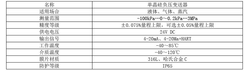單晶硅負壓變送器采用先進的單晶硅壓力傳感器技術與專利封裝工藝,精心研制出的一款國際領先技術的超高性能壓力變送器,測量精度高達0.075級,特有的雙過載保護膜設計,單向過壓高達40MPa,用于測量液體、氣體或蒸汽的液位、密度、壓力,然后將其轉變成4-20mA HART電流信號輸出,通過他們進行參數設定、過程控制。