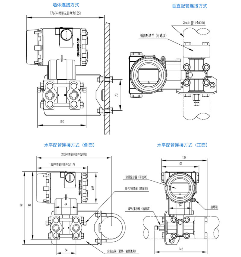 1.防止變送器與腐蝕性或過熱的補測介質相接觸 2.要防止渣滓在導壓管內沉積 3.導壓管要盡可能短一些 4.兩邊導壓管內的液柱壓頭應保持平衡 5.導壓管應安裝在溫度梯度和溫度波動小的地方 6.防止引壓管內結晶或低溫結冰 7.請勿將排氣/排液閥全部擰開,以免密封鋼珠掉落