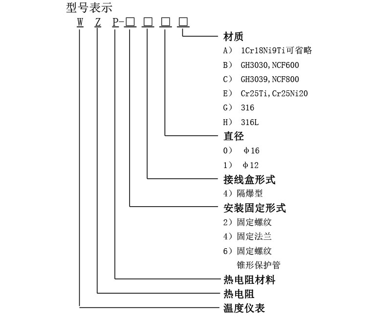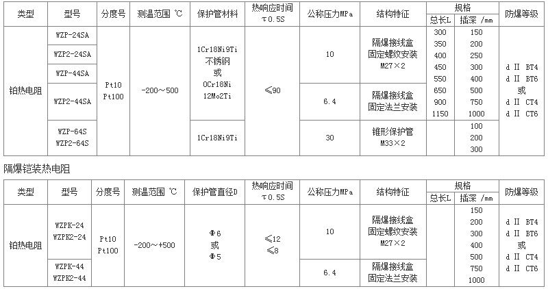 隔爆熱電阻和裝配式熱電阻的結構,原理基本相同,所區別的是隔爆型產品的接線盒(外殼)在設計上采用防爆特殊的結構,接線盒用高強度鋁合金壓鑄而成,并具有足夠的內部空間、壁厚和機械強度、橡膠密封圈的熱穩定性符合國家防爆標準,所以,當接線盒內部的爆炸性混合氣體發生爆炸時,其內壓不會破壞接線盒,而由此產生的熱能不能向外擴散、傳爆。由于產品采用上述防爆特殊結構,使產品完全符合使用在dⅡBT4或dⅡCT6防爆溫度級別區間范圍內,只要用戶嚴格遵守產品使用規則,產品就能達到可靠的防爆效果。