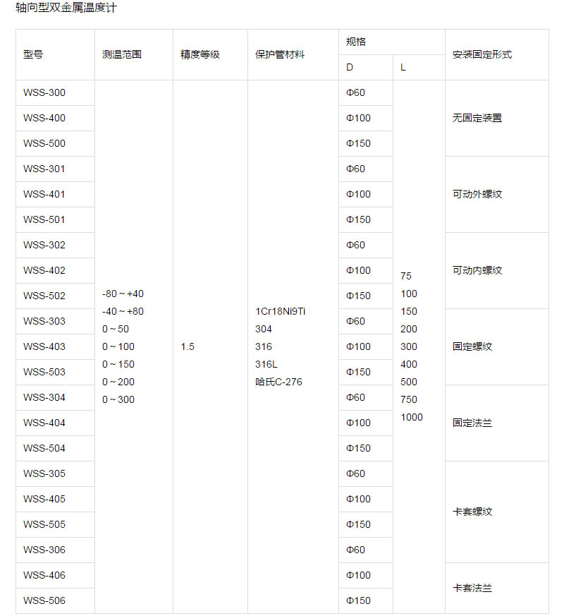 雙金屬溫度計選型須知:請提供型號、表盤直徑、精度等級、安裝固定形式、測溫范圍、保護管材質、長度或插入深度。選型舉例:萬向型雙金屬溫度計,表盤直徑Φ100,測溫范圍0~400℃,1.5級,活動外螺紋M27×2,長度450mm WSS-481, 0~400℃,L=450, M27×2,1.5級