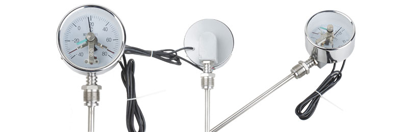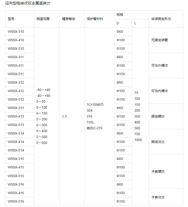 電接點雙金屬溫度計選型須知:請?zhí)峁┬吞、表盤直徑、精度等級、安裝固定形式、測溫范圍、保護(hù)管材質(zhì)、長度或插入深度。選型舉例:萬向型電接點雙金屬溫度計,表盤直徑Φ100,測溫范圍0~400℃,1.5級,活動外螺紋M27×2,長度450mm WSSX0-481, 0~400℃,L=450, M27×2,1.5級