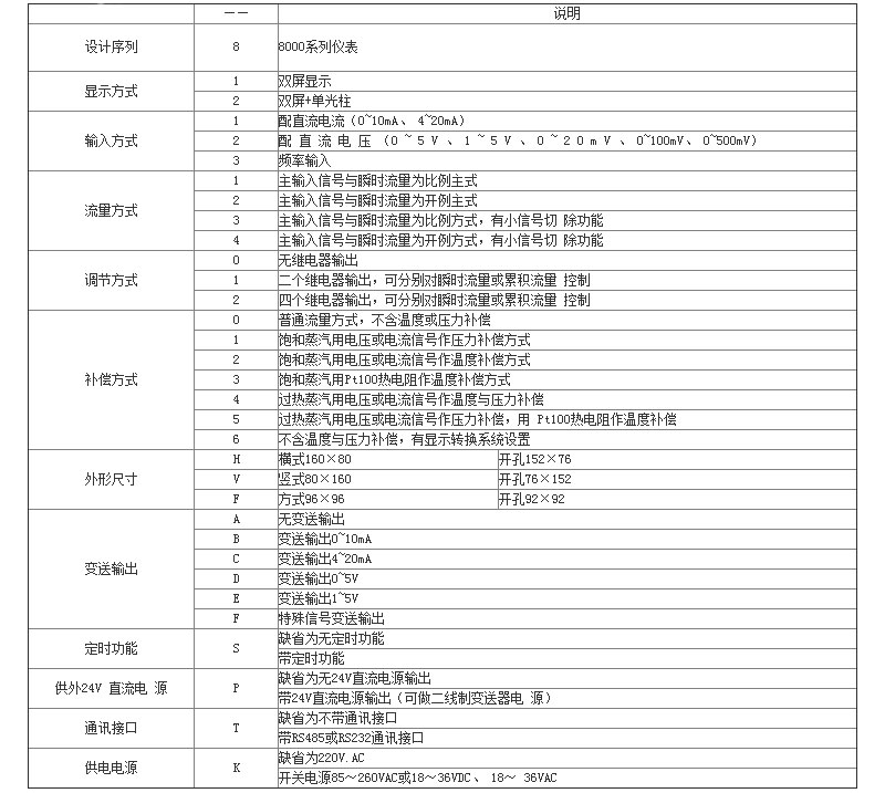 1.測量精度:±0.5%FS+1字 2.調節控制精度:位式:±0.5%FS 3.報警功能:上限、廿限、上下限、下回差、雙回差、OK方式、絕對值方式等 4.變送輸出精度:±0.5%FS 負載能力:0-600Ω 5.輸入阻抗:0-10mA:500Ω、4-20mA:250Ω、DC.V:≥200KΩ 脈沖幅值:≥2.5V,頻率范圍 0.01-10000Hz 6.繼電器接點容量:AC220V 2A 7.供電電源:AC220V≤6W AC110V DC24V 8.工作環境要求:溫度:0-50℃、相對濕度:<85%,無腐蝕性氣體,允許低震動場合